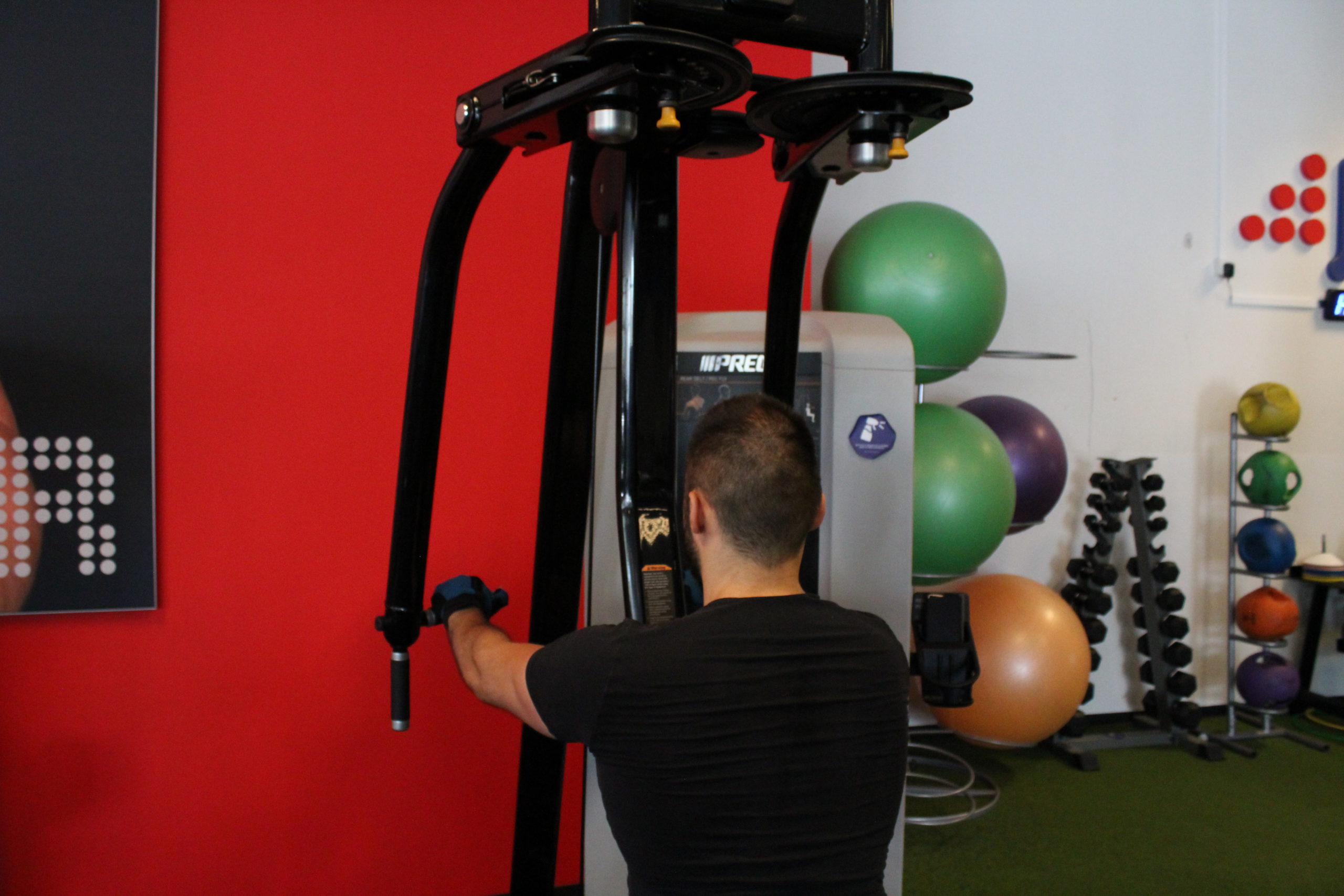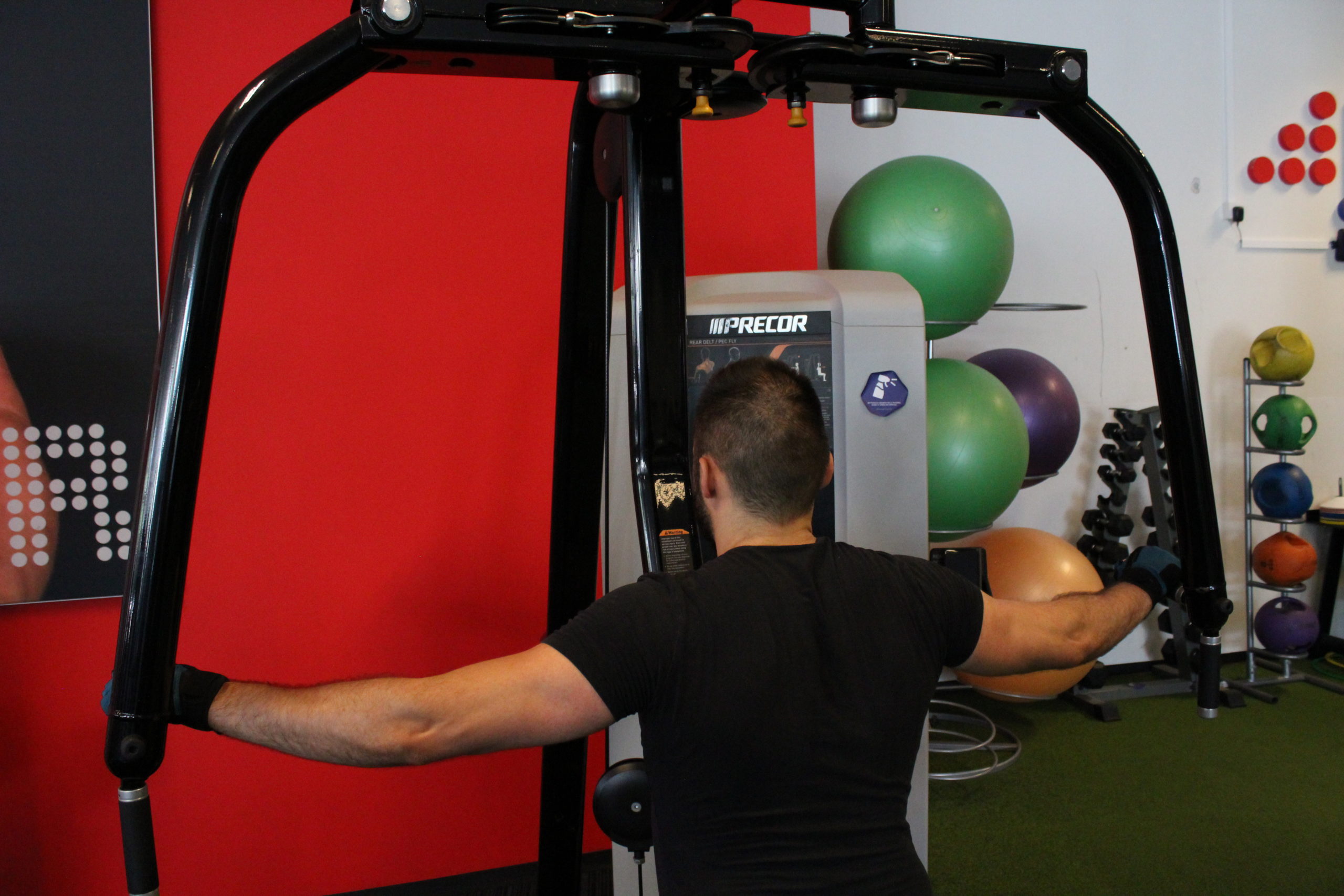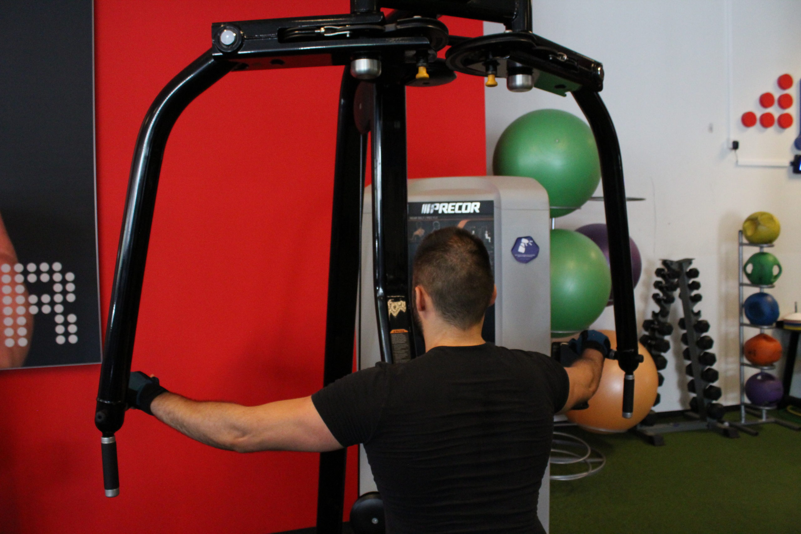 Assis sur le siège de la machine, torse contre le dossier de celle-ci, une poignée dans chaque main en prise neutre ou pronation (à votre convenance), le but de l’exercice consistera à écarter les bras en passant d’une position bras tendus devant vous à une position bras en « croix » à la force de vos arrières d’épaules.