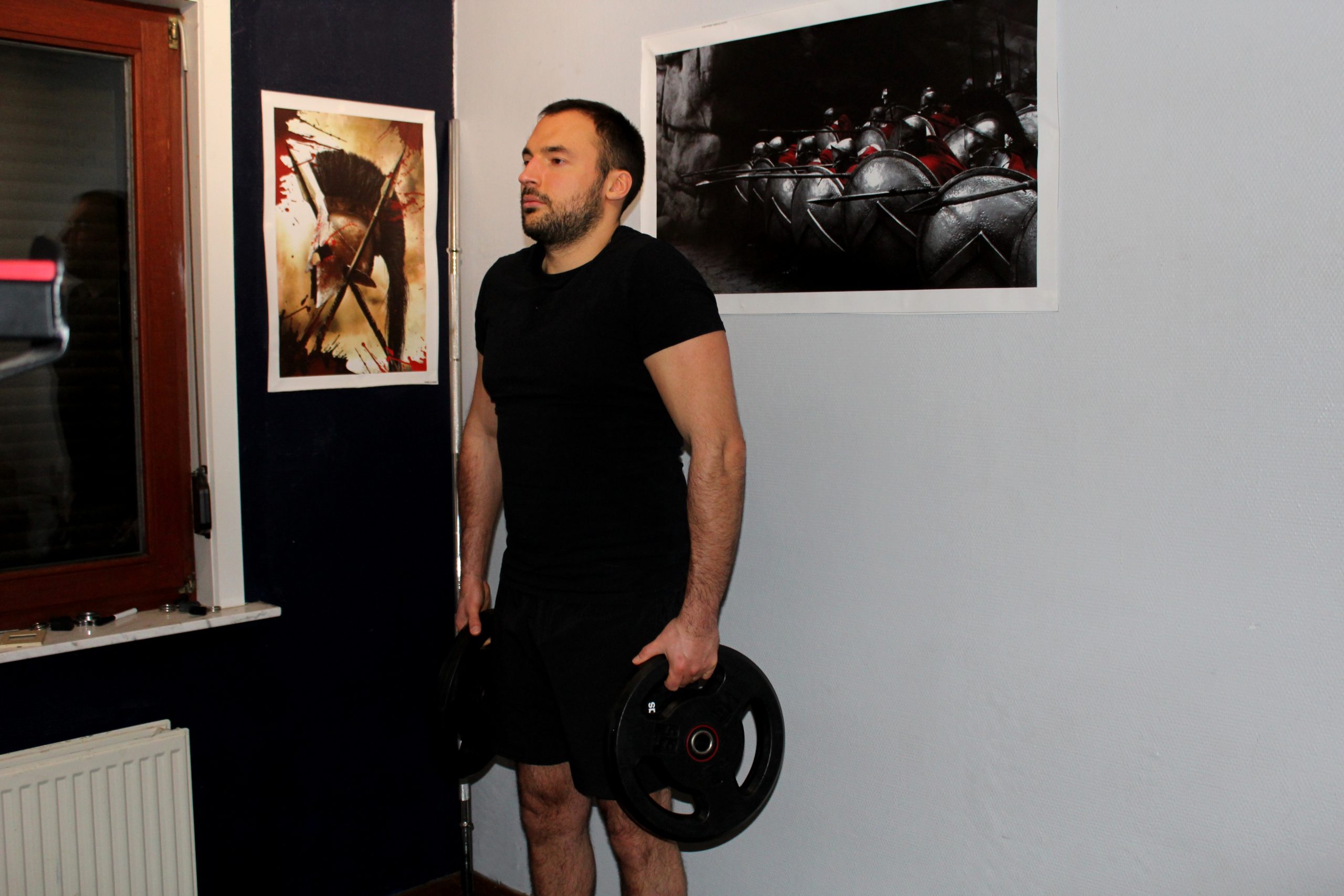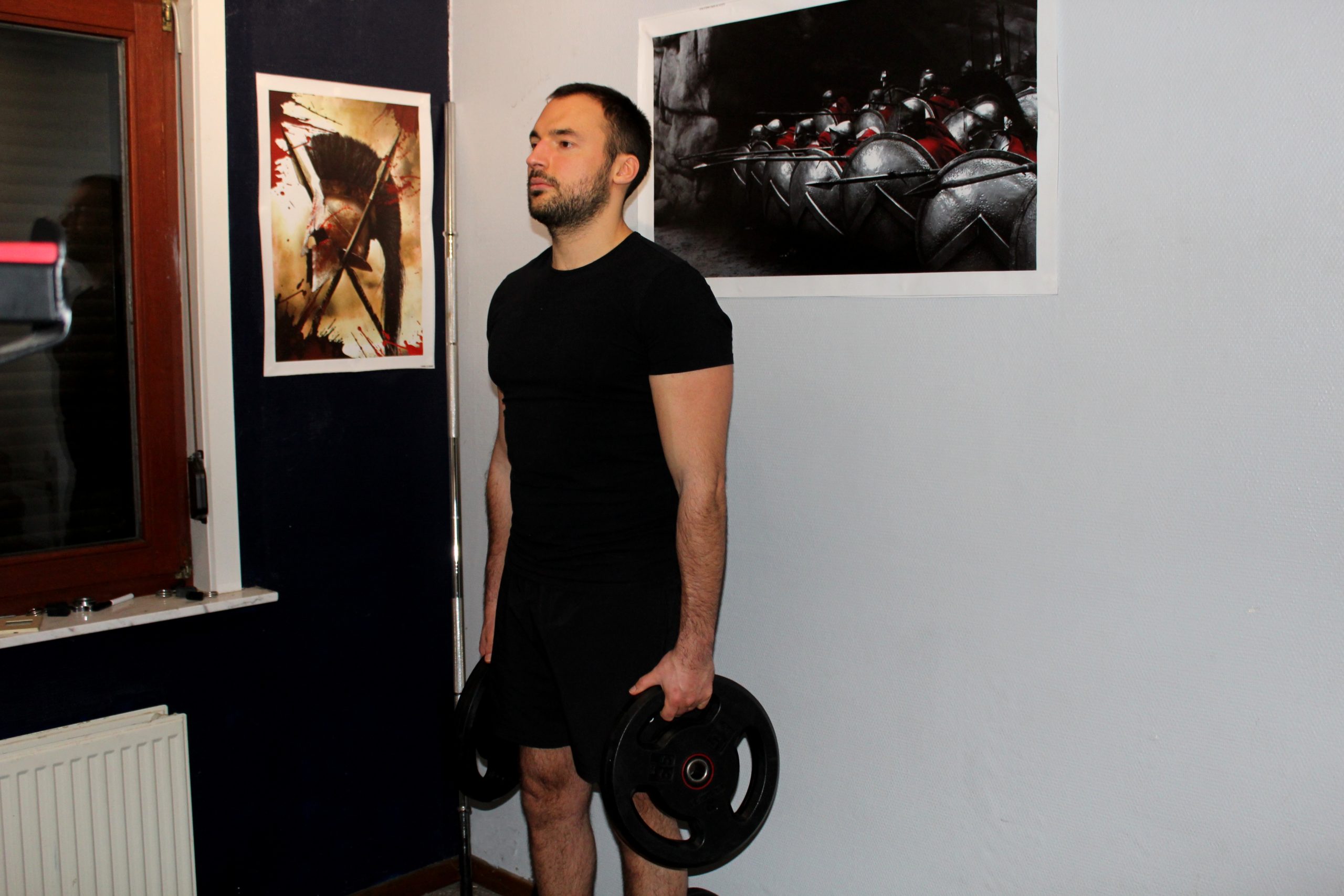 Placez en position debout, bras le long du corps avec un haltère dans chaque main en prises neutre (le pouce vers l’avant), le but du mouvement consistera à effectuer des haussements d’épaules, afin de les rapprocher au maximum de votre tête.